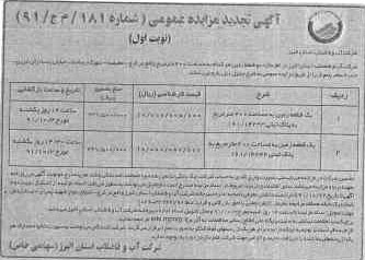 تضمین شركت در مزایده می بایستی بصورت واریز نقدی به حساب شركت , چك بانكی تضمین شده و یا ضمانت نامه بانكی باشد. هزینه درج دو نوبت آگهی در روزنامه بعهده برنده مزایده می باشد , سایر اطلاعات و جزئیات مربوط در اسناد مزایده مندرج است. داوطلبان میتوانند به منظور دریافت اسناد مزایده از انتشار نوبت دوم آگهی تا تاریخ 22/9/91 با دردست داشتن معرفی نامه به اداره دبیرخانه شركت آب وفاضلاب استان البرز واقع دركرج- انتهای بلوارشهید چمران ـ ساختمان شماره یك طبقه همكف مراجعه نمایند. (تلفن تماس با امور بازرگانی و قراردادها 32244796- 026)