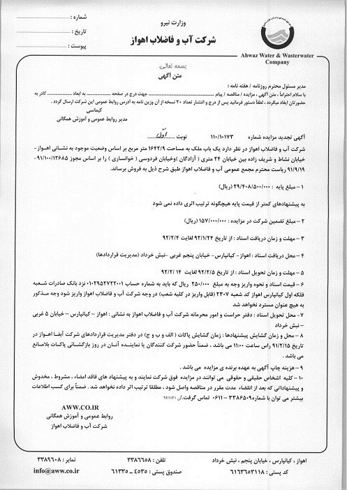 شركت آب و فاضلاب اهواز در نظر دارد یك باب ملك به مساحت 9/1642 متر مربع بر اساس وضعیت موجود به نشانی اهواز- خیابان نشاط و شریف زاده بین خیابان 24 متری ( آزادگان )وخیابان فردوسی ( خوانساری ) را بر اساس مجوز 12685/100/91- 19/9/91 ریاست محترم مجمع عمومی آب و فاضلاب اهواز طبق شرح ذیل به فروش برساند.
