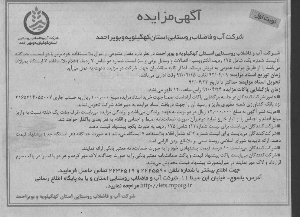 شركت آب وفاضلاب روستایی استان كهگیلویه وبویراحمددرنظر دارد مقدارمتنوعی از اموال بلااستفاده خودبرابر با دو لیست جداگانه [(لیست شماره یك ،شامل 175ردیف الكتروپمپ –اتصالات و وسایل برقی و...)لیست شماره دو شامل 7 ردیف (اقلام بلااستفاده 7 ایستگاه پمپاژ)] می باشد را از طریق مزایده عمومی به فروش برساند . لذا از كلیه متقاضیان جهت شركت در مزایده دعوت به عمل می آید .