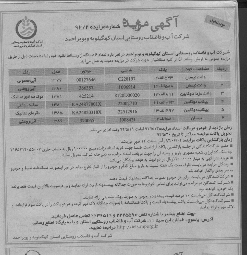 شركت آب وفاضلاب روستایی استان كهگیلویه وبویراحمددرنظر دارد تعداد 6 دستگاه از وسائط نقلیه خود را با مشخصات ذیل از طریق مزایده عمومی به فروش برساند . لذا از كلیه متقاضیان جهت شركت در مزایده دعوت به عمل می آید .