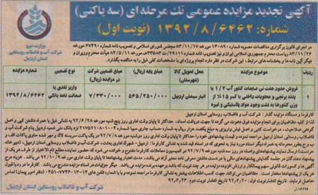 تاریخ:18/06/1392 شماره:6464/8/1392 | | ((اسنادتجدید مزایده عمومی تك مرحله سه پاكتی)) بدینوسیله شركت آب و فاضلاب روستایی استان اردبیل در اجرای قانون برگزاری مناقصات مصوبه شماره 130890 مورخه 17/11/83 مجلس شورای اسلامی و تصویب نامه شماره 67490 مورخه 26/1//83 ریاست محترم جمهوری اسلامی ایران و نیز تصویب نامه شماره 29111/ت 33583 هـ مورخه 11/5/84 هیات محترم وزیران و دیگر آئین نامه ها و بخشنامه های مرتبط ، در نظر داردحدود هفت تن ضایعات كنتورآب 2/1با كسر پانزده درصد از وزن كنتور ، بعلت وجود مواد پلاستیكی وغیره مقدار كل وزن كنتور به 5950 كیلوگرم می رسد كه به شرح ذیل از طریق مزایده به فروش برساند .لذا كلیه متقاضیان می توانند حداكثر تا پایان وقت اداری روز پنج شنبه مورخ 28/6/92 با در دست داشتن فیش به مبلغ یكصد هزار ریال واریز به شماره حساب سیبا2175210801004 بنام شركت آب و فاضلاب روستایی استان اردبیل به دفتر امور پیمان شركت واقع در اردبیل : شهرك اداری ، شركت آب وفاضلاب روستایی استان اردبیل ، كد پستی 5615813161 مراجعه و اسناد تهیه نموده تا جهت بازدید از موضوع مزایده اقدام لازم صورت گیرد . موضوع مزایده عبارتست از : | ردیف | موضوع مزایده | محل تحویل كالا | قیمت پایه (به ریال ) | مبلغ تضمین در مزایده (به ریال ) | | 1 | فروش ضایعات كنتور آب 2/1 بابدنه برنجی با محتویات داخلی | انبار سامیان 10 كیلومتری جاده اردبیل – مشگین شهر از توابع اردبیل | 565،250،000 | 7،330،000 | كارفرما و مزایده گزار : شركت آب وفاضلاب روستایی استان اردبیل پیشنهاد دهنده باید نسبت به تهیه و ارسال مدارك ذیل در پاكتهای الف ، ب ، ج بصورت جداگانه اقدام نماید . پاكت الف محتوی تضمین شركت در مزایده به شرح و مبلغ ذیل : مبلغ تضمین شركت در مزایده هفت میلیون و سیصد و سی هزار ریال مطابق جدول فوق الذكر می باشد كه به یكی از صورتهای مشروحه ذیل در پاكت الف همراه با دیگر اسناد مزایده و پاكتها ، به دستگاه كارفرما تسلیم گردد . اصل رسید بانكی واریز وجه مزبور به حساب جاری سیبا به شماره 2175210804009 نزد بانك ملی اردبیل بنام شركت آب و فاضلاب روستایی استان اردبیل یا ضمانتنامه بانكی شركت در مزایده معتبر تا تاریخ 9/10/92 به پیشنهاد فاقد سپرده ، سپرده های مخدوش ، سپرده های كمتر ازمیزان مقرر ، چك شخصی و نظایر آن ترتیب اثر داده نخواهد شد . پاكت (ب) محتوای مدارك شناسایی است كه اشخاص حقیقی كپی شناسنامه صفحه اول و توضیحات و پشت و روی كارت ملی و اشخاص حقوقی ، اساسنامه – آگهی تاسیس و تغییرات مندرج در روزنامه رسمی جمهوری اسلامی ایران و كپی شناسنامه و كارت ملی صاحبان امضاء مجاز تعهد آور و اسناد مزایده و دیگر صفحات پیوستی را كه مهر و امضاء شده باید ارائه نمایند . پاكت (ج) محتوی قیمت پیشنهادی می باشد . هر سه پاكت فوق الذكر بصورت سربسته لاك و مهر شده ، در یك پاكت سربسته لاك و مهر شده دیگر با ذكر موضوع و شماره مزایده و نام پیشنهاد دهنده در روی پاكت ها به طور محرمانه حداكثر تا پایان وقت اداری روزدوشنبه مورخ 8/7/92 به دبیر خانه حراست شركت به نشانی كارفرما تحویل گردد و رسید دریافت شود . پیشنهاد های واصله درساعت 9 صبح روز سه شنبه مورخه 9/7/92 در كمیسیون معاملات كارفرما بازگشائی و خوانده می شود كه حضور نماینده مطلع و تام الاختیار از طرف هر یك از پیشنهاد دهندگان در جلسه گشایش پیشنهادهای مالی با همراه داشتن معرفی نامه معتبر آزاد می باشد . به پیشنهادهای فاقد امضاء ، مشروط ، مخدوش و پیشنهاداتی كه بعد از انقضاء مدت مقرر در آگهی و اسناد مزایده واصل شود ، مطلقا" ترتیب اثر داده نخواهد شد . كارفرما می تواند مقدار قرارداد را به میزان حداكثر 25% كسر یا اضافه نماید كه براساس همان قیمت پیشنهادی هست . كمیسیون در رد یا قبول هر یك یا تمام پیشنهادها مختار است . مدت اعتبار پیشنهاد ها تا پایان وقت اداری مورخه 9/10/92 می باشد . نحوه دریافت بهای معامله بطور نقد و حداكثر پانزده روز پس از ابلاغ برنده شدن می باشد . - مبلغ معامله برابر با وزن كنتورها با محتویات داخلی با كسر حدود پانزده درصد بعلت وجود مواد 
