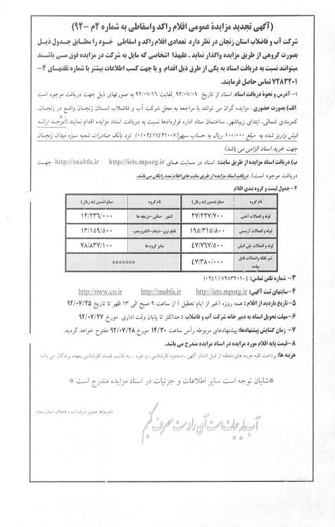 (آگهی تجدید مزایدة عمومی اقلام راكد واسقاطی به شماره 2م -92)