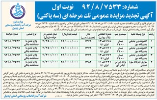 بدینوسیله شركت آب و فاضلاب روستایی استان اردبیل در اجرای قانون برگزاری مناقصات مصوبه شماره 130890 مورخه 17/11/83 مجلس شورای اسلامی و تصویب نامه شماره  67490 مورخه 26/1//83 ریاست محترم جمهوری اسلامی ایران و نیز تصویب نامه شماره 29111/ت 33583 هـ مورخه 11/5/84 هیات محترم وزیران و دیگر آئین نامه ها و بخشنامه های مرتبط ، در نظر داردیكدستگاه خودرو به شرح ذیل از طریق مزایده به فروش برساند .لذا كلیه متقاضیان می توانند حداكثر تا پایان وقت اداری  روزیك شنبه مورخه 21/7/92 با در دست داشتن فیش به مبلغ یكصد هزار ریال واریز به شماره حساب سیبا2175210801004    بنام شركت آب و فاضلاب روستایی استان اردبیل به دفتر امور پیمان و رسیدگی شركت واقع در اردبیل : شهرك اداری ، شركت آب وفاضلاب روستایی استان اردبیل ، كد پستی 5615813161  مراجعه و اسناد تهیه نموده تا جهت بازدید از موضوع مزایده اقدام لازم صورت گیرد .