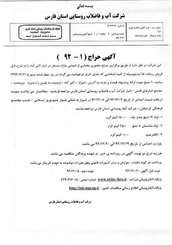 این شركت در نظر دارد از طریق برگزاری حراج حضوری مقداری از اجناس مازاد مستقر در انبار اكبر آباد را به شرح ذیل فروش رساند، لذا بدینوسیله از كلیه اشخاصی كه تمایل دارند درخواست می گردد در روز چهارشنبه مورخ 21/12/1392 ساعت 10 صبح جهت ارائه پیشنهاد قیمت و خرید به آدرس : شیراز – اكبر آباد – نرسیده به پلیس راه شیراز ، مرودشت - مجتمع انبارهای قدس – انبار شركت آب و فاضلاب روستایی استان فارس مراجعه فرمایند . متقاضیان می توانند جهت دریافت لیست اجناس از تاریخ 03/12/92 الی 08/12/92 در شیراز به نشانی بلوار جمهوری اسلامی – جنب مجتمع فرهنگی كریمخان – شركت آبفا روستایی استان فارس مراجعه نمایند .