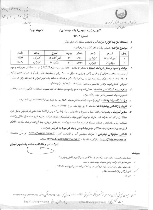 1. دستگاه مزایده گزار : شركت آب و فاضلاب منطقه یك شهر تهران