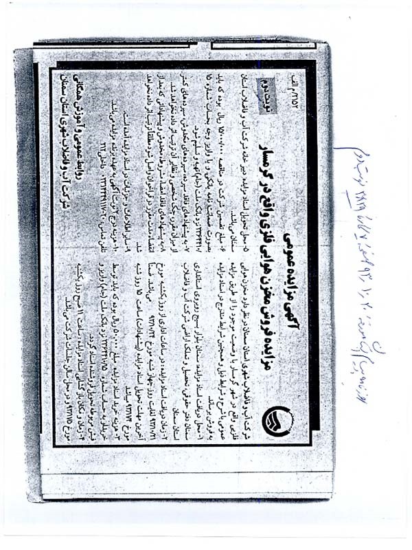 شركت آب و فاضلاب شهری استان سمنان در نظر دارد مخزن هوایی فلزیی واقع در شهر گرمسار با وضعیت موجود را از طریق مزایده عمومی با شرح و شرایط ذیل و همچنین شرایط مندرج در اسناد مزایده به فروش برساند. 1- محل دریافت اسناد مزایده : سمنان بلوار بسیج روبروی استانداری سمنان دفتر حقوقی ، تحصیل و تملك اراضی شركت آب و فاضلاب استان سمنان 2- زمان دریافت اسناد مزایده : در ساعات اداری از روز یكشنبه مورخ 21/10/93 لغایت روز چهار شنبه مورخ 24/10/93 می باشد . ضمناً آخرین مهلت تحویل اسناد مزایده ( پیشنهادات ) ساعت 15 روز شنبه مورخ 4/11/93 میباشد 3- هزینه خرید اسناد مزایده مبلغ 50.000 ریال بوده كه باید توسط خریدار به حساب شماره 15/2364410 نزد بانك ملت (جام )واریز و فیش مربوطه تحویل فروشنده اسناد گردد. 4- زمان و مكان باز گشایی اسناد مزایده : ساعت 11 صبح روز یكشنبه مورخ 5/11/93 و در محل سالن جلسات شركت میباشد. 5- محل تحویل اسناد مزایده دبیر خانه شركت آب و فاضلاب استان سمنان میباشد. 6- مبلغ تضمین شركت در مناقصه 15000000ریال بوده كه باید بصورت ضمانت نامه بانكی و یا واریز وجه بحساب شماره 15 /2364410 نزد بانك ملت (جام ) تهیه و تسلیم شود0 7- به پیشنهاد های فاقد سپرده ، سپرده های مخدوش ، سپرده های كمتر از میزان مقرر ، چك شخصی و نظایر آن ترتیب اثر داده نخواهد شد 0 8- به پیشنهاد های فاقد امضا ، مشروط ، مخدوش ، و پیشنهاداتی كه بعد از انقضائ مدت مقرر در فراخوان واصل شود مطلقاً ترتیب اثر داده نخواهد شد 0 9- سایر اطلاعات و جزئیات در اسناد مزایده آمده است 0 10- هزینه درج 2 نوبت آگهی بعهده برنده مزایده می باشد 0 تلفن تماس: 20-02333449117 داخلی212 |