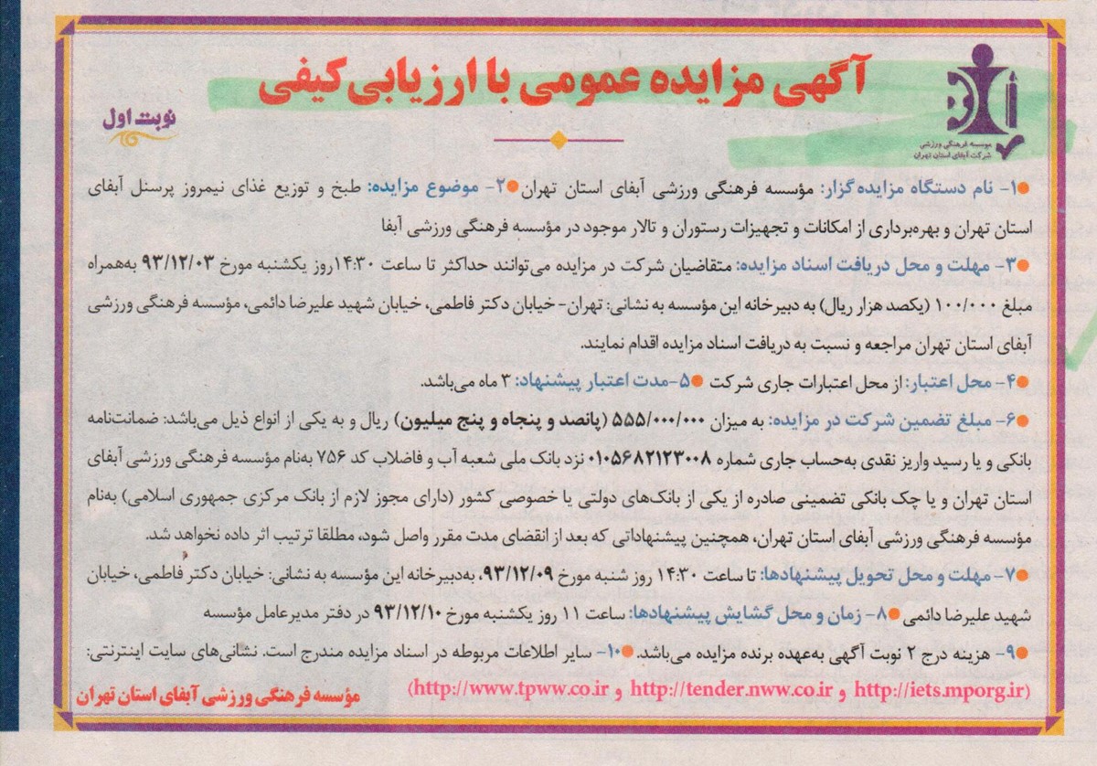 طبخ و توزیع غذای نیمروز پرسنل آبفای استان تهران و بهره برداری از امكانات و تجهیزات رستوران و تالار موجود در مؤسسه فرهنگی ورزشی آبفا.