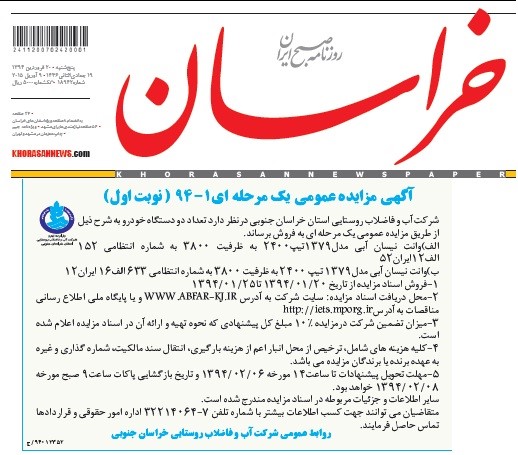 آگهی مزایده عمومی یك مرحله ای 1-94 شركت آب و فاضلاب روستایی استان خراسان جنوبی در نظر دارد تعداد دو دستگاه خودرو به شرح ذیل از طریق مزایده عمومی یك مرحله ای به فروش برساند. الف) وانت نیسان آبی مدل 1379 تیپ 2400به ظرفیت 3800 به شماره انتظامی 152الف 12 ایران 52 ب) وانت نیسان آبی مدل 1379 تیپ 2400به ظرفیت 3800 به شماره انتظامی 633 الف 16 ایران 12 1- فروش اسناد مزایده از تاریخ 20/01/1394 تا 25/01/1394 2- محل دریافت اسناد مزایده: 3-سایت شركت به آدر س WWW.ABFAR-KJ.ir و یا پایگاه ملی اطلاع رسانی مناقصات به آدرس http:// iets.mporg.ir 4- میزان تضمین شركت در مزایده %10 مبلغ كل پیشنهادی كه نحوه تهیه و ارائه آن در اسناد مزایده اعلام شده است. 5- كلیه هزینه های شامل ، ترخیص از محل انبار اعم از هزینه بارگیری، انتقال سند مالكیت، شماره گذاری و غیره به عهده برنده یا برندگان مزایده می باشد. 6-مهلت تحویل پیشنهادات تا ساعت 14 مورخه 06/02/1394 و تاریخ بازگشایی پاكات ساعت 9صبح مورخه 08/02/1394 خواهد بود. سایر اطلاعات و جزئیات مربوطه در اسناد مزایده مندرج شده است. متقاضیان میتوانند جهت كسب اطلاعات بیشتر با شماره تلفن 7-32214064 اداره امور حقوقی و قراردادها تماس حاصل فرمایند. |