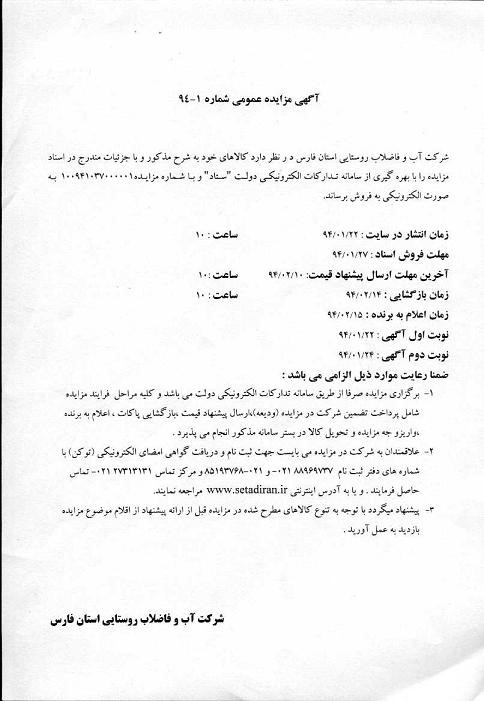 شركت آب و فاضلاب روستایی استان فارس د ر نظر دارد كالاهای خود به شرح مذكور و با جزئیات مندرج در اسناد مزایده را با بهره گیری از سامانه تداركات الكترونیكی دولت "ستاد" و با شماره مزایده100941037000001 به صورت الكترونیكی به فروش برساند.