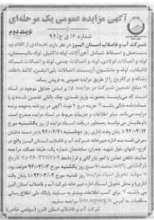 شركت آب وفاضلاب استان البرز درنظردارد تعدادی از اقلام نو, مستعمل و اسقاط شامل آهن آلات, لوله داكتیل, لوله مانیسمان, لوله و اتصالات فولادی, لوله و اتصالات چدنی, لوله واتصالات شبكه فاضلاب, لوله و مانشون آزبست, اتصالات پلی اتیلن, كاغذ باطله و بشكه پركلرین را از طریق مزایده عمومی بفروش رساند.