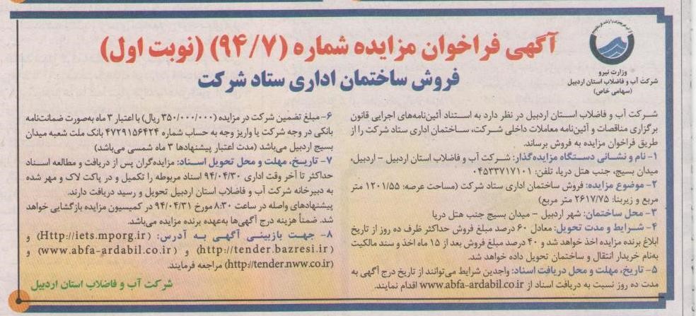 آگهی فراخوان مزایده شماره ( 7/94) (نوبت اول و دوم) فروش ساختمان اداری ستاد شركت شركت آب وفاضلاب استان اردبیل در نظر دارد به استناد آیین نامه های اجرائی قانون برگزاری مناقصات و آئین نامه معاملات داخلی شركت ، ساختمان اداری ستاد شركت را از طریق فراخوان مزایده به فروش برساند . 1ـ نام و نشانی دستگاه مزایده گزار : شركت آب و فاضلاب استان اردبیل .اردبیل : میدان بسیج جنب هتل دریا تلفن:04533717101 2- موضوع مزایده : فروش ساختمان اداری ستاد شركت(مساحت عرصه:55/1201 مترمربع و زیربنا:75/2617 مترمربع) 3- محل ساختمان: شهراردبیل- میدان بسیج جنب هتل دریا 4- شرایط و مدت تحویل: معادل 60 درصد مبلغ فروش حداكثر ظرف ده روز از تاریخ ابلاغ برنده مزایده اخذ خواهد شد و 40 درصد مبلغ فروش بعد از 15 ماه اخذ و سند مالكیت به نام خریدار انتقال و ساختمان تحویل داده خواهد شد. 5-تاریخ مهلت و محل دریافت اسناد : واجدین شرایط میتوانند از تاریخ درج آگهی به مدت ده روز نسبت به دریافت اسناد ازwww.abfa-ardabil.co.ir اقدام نمایند. 6- مبلغ تضمین شركت در مزایده 350/000/000)ریال (با اعتبار 3 ماه بصورت ضمانت نامه بانكی در وجه شركت یا واریز وجه به حساب شماره 4729156424 بانك ملت شعبه میدان بسیج اردبیل می باشد.( مدت اعتبار پیشنهادها 3 ماه شمسی می باشد .) 7- تاریخ مهلت و محل تحویل اسناد : مزایده گران پس از دریافت و مطالعه اسناد حداكثر تا آخر وقت اداری 30/04/94 اسناد مربوطه را تكمیل ودر پاكت های لاك و مهر شده به دبیرخانه شركت آب و فاضلاب استان اردبیل تحویل ورسید دریافت دارند. پیشنهادهای واصله در ساعت 8:30 مورخ 31/04/94 در كمیسیون مزایده بازگشایی خواهد شد. ضمنا" هزینه درج آگهی ها بعهده برنده مزایده می باشد. 8- جهت بازبینی آگهی به آدرس : (Http://iets.mporg.ir ( و (http://tender.bazresi.ir) و (co.ir.www.abfa-ardabil) و(http://tender.nww.co.ir) مراجعه فرمایند. شركت آب و فاضلاب استان اردبیل |