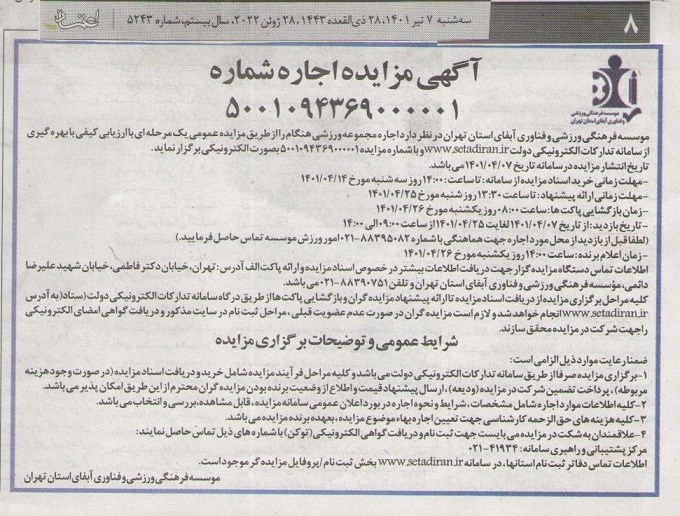 مؤسسه فرهنگی ورزشی و فناوری آبفای استان تهران در نظر دارد اجاره مجموعه ورزشی هنگام را از طریق مزایده عمومی یک مرحله ای با ارزیابی کیفی با بهره گیری از سامانه تدارکات الکترونیکی دولت www.setadiran.irو با شماره مزایده 5001094369000001 بصورت الکترونیکی برگزار نماید .