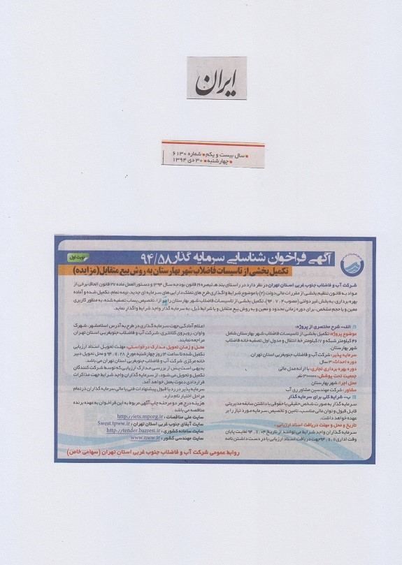 فراخوان شناسایی سرمایه گذار تكمیل بخشی از تاسیسات فاضلاب شهر بهارستان به روش بیع متقابل ( مزایده )