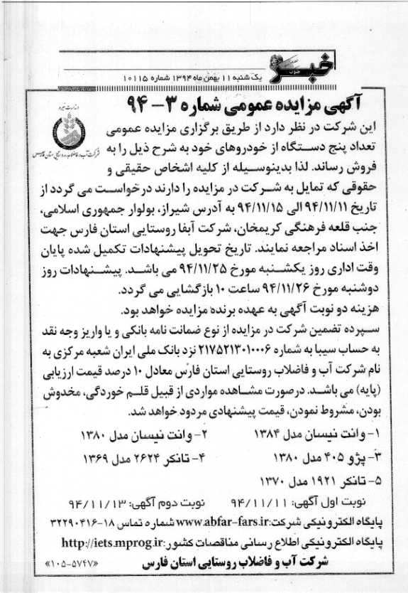 این شركت در نظر دارد از طریق برگزاری مزایده عمومی تعداد پنج دستگاه از خودروهای خود به شرح ذیل را به فروش رساند . لذا بدینوسیله از كلیه اشخاص حقیقی و حقوقی كه تمایل به شركت در مزایده را دارند درخواست می گردد از تاریخ 11/11/94 الی 15 /11/94 به آدرس شیراز بلوار جمهوری اسلامی – جنب قلعه فرهنگی كریمخان – شركت آبفا روستایی استان فارس جهت اخذ اسناد مراجعه نمایند . تاریخ تحویل پیشنهادات تكمیل شده پایان وقت اداری روز یكشنبه مورخ 25/11/94 می باشد . پیشنهادات روز دوشنبه مورخ 26/11/94 ساعت 10 بازگشایی می گردد.