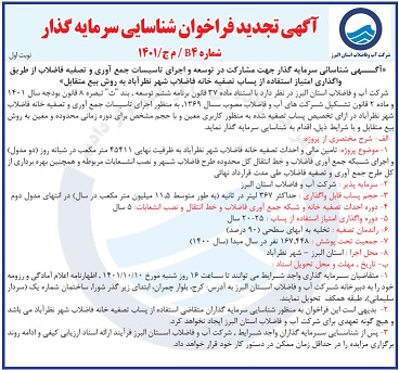 شناسایی سرمایه گذار جهت مشارکت در توسعه و اجرای تاسیسات جمع آوری و تصفیه فاضلاب از طریق واگذاری امتیاز استفاده از پساب تصفیه خانه فاضلاب شهر نظرآباد به روش بیع متقابل (تجدید)