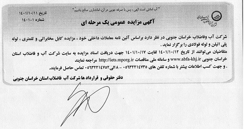 فروش حدود 827723 کیلوگرم لوله فولادی در سایزهای مختلف واقع در خط انتقال شهرستان فسا