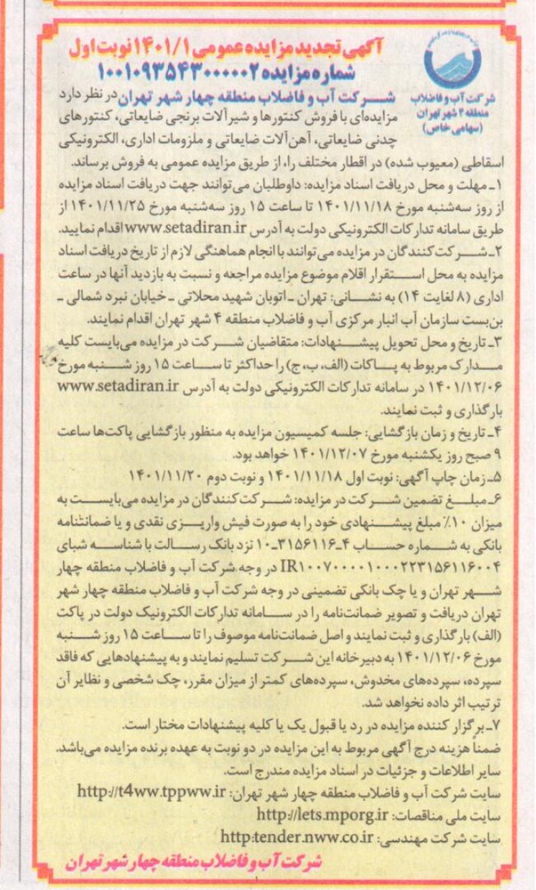 شركت آب و فاضلاب منطقه چهار شهر تهران در نظر دارد مزایده ای با فروش کنتورها و شیرآلات برنجی ضایعاتی ، کنتورهای چدنی ضایعاتی ، آهن آلات ضایعاتی و ملزومات اداری ، الکترونیکی اسقاطی (معیوب شده) در اقطار مختلف را ، از طريق مزايده عمومي به فروش برساند .