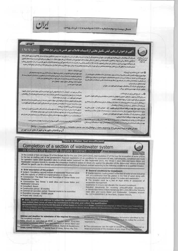 تکمیل تامین مالی و احداث مدول دوم تصفیه خانه فاضلاب شهرقدس از طریق واگذاری امتیاز استفاده از پساب تصفیه خانه فاضلاب شهر قدس به روش بیع متقابل (به ظرفیت 28650 متر مکعب در شبانه روز )،مطابق مشخصات فنی، استاندارد های ملی و خواسته های سرمایه پذیر.