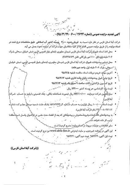 تجدید چهارم مزایده واگذاری یک باب ساختمان سابق و واحد تجاری امور آبفای ابهر به صورت قرارداد اجاره به شماره 4م-97