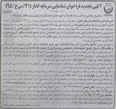 39 - فراخوان شناسایی سرمایه گذار تکمیل بخشی از تاسیسات فاضلاب شهرجدید هشتگرد به روش بیع متقابل / آبفا استان البرز