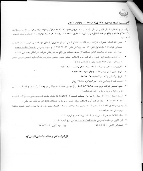 فروش حدود 827723 کیلوگرم لوله فولادی در سایزهای مختلف واقع در خط انتقال شهرستان فسا