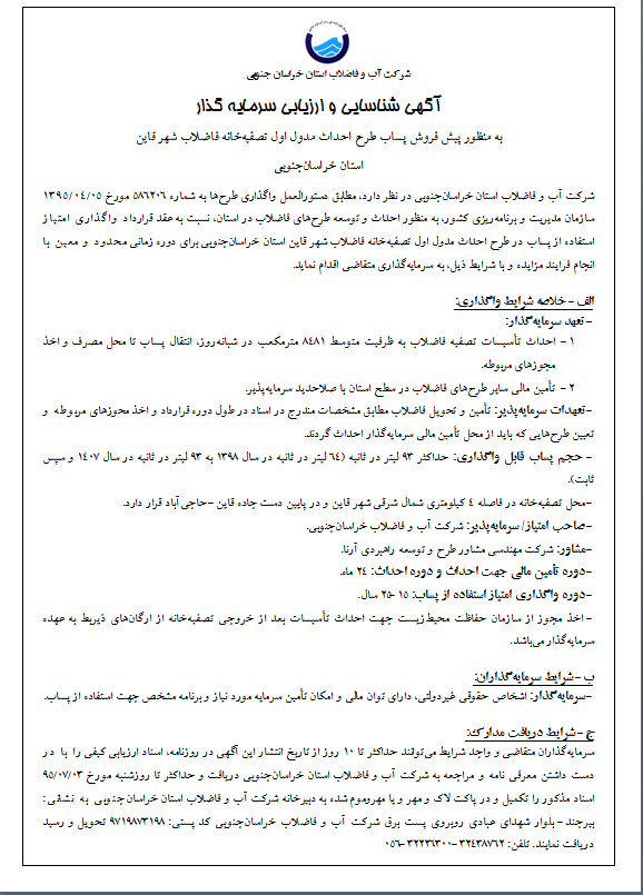 شرکت آب و فاضلاب استان خراسان‌جنوبی در نظر دارد، مطابق دستورالعمل واگذاری طرح‌ها به شماره 586206 مورخ 05/04/1395 سازمان مدیریت و برنامه‌ریزی کشور، به منظور احداث و توسعه طرح‌های فاضلاب در استان، نسبت به عقد قرارداد واگذاری امتیاز استفاده از پساب در طرح احداث مدول اول تصفیه‌خانه فاضلاب شهر قاین استان خراسان‌جنوبی برای دوره زمانی محدود و معین با انجام فرایند مزایده و با شرایط ذیل، به سرمایه‌گذاری متقاضی اقدام نماید.