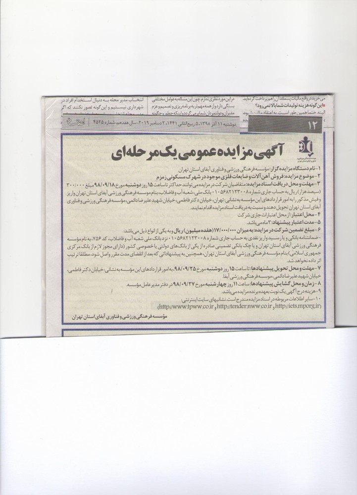 9- هزینه درج آگهی یک نوبت بعهده برنده مزایده می باشد.