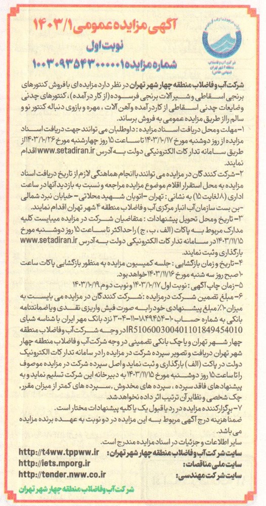 آگهی مزایده عمومی 1/1403 - نوبت اول شماره مزایده 1003093543000001