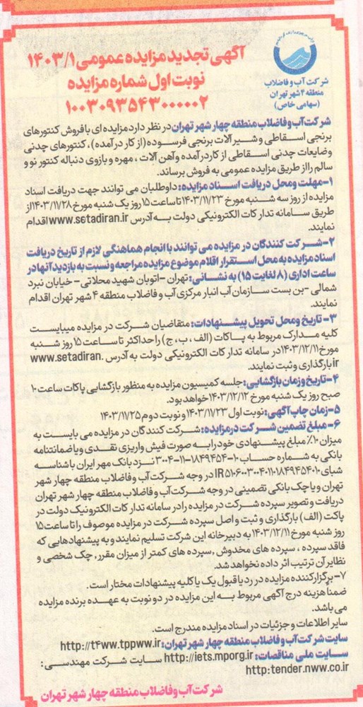 شركت آب و فاضلاب منطقه چهار شهر تهران در نظر دارد مزایده ای با فروش کنتورهای برنجی اسقاطی و شیرآلات برنجی فرسوده)از کار درآمده)، کنتورهای چدنی وضایعات چدنی اسقاطی ازکاردرآمده و آهن آلات ، مهره و بازوی دنباله کنتور نو و سالم را از طريق مزايده عمومي به فروش برساند .