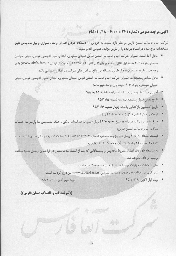 فروش 5 دستگاه خودرو واقع در ایستگاه پمپاژ شماره 4 امور آب و فاضلاب مرودشت زرین دشت
