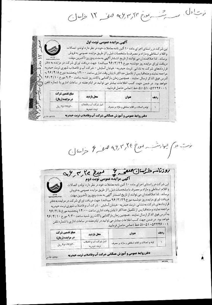 این شرکت در راستای اجرای ماده 10 آئین نامه معاملات خود در نظر دارد لوله و اتصالات و اقلام اسقاطی و مازاد بر مصرف با مشخصات ذیل را از طریق مزایده عمومی به فروش رساند. لذا علاقمندان می توانند از تاریخ انتشار آگهی به مدت پنج روز (آخرین مهلت دریافت اوراق مزایده روز دو شنبه مورخ 29/03/96 میباشد. ) جهت دریافت اوراق شرکت در مزایده به دفتر قراردادهای شرکت به نشانی : تربت حیدریه –خیابان آسایش-شرکت آب و فاضلاب شهری تربت حیدریه مراجعه نمایند و متعاقباً پس ازتکمیل حداکثر تا پایان وقت اداری ساعت 14:00 پنج شنبه شنبه مورخ 08/04/96 به آدرس فوق الذکر ارسال نمایند. همچنین زمان بازگشایی پاکات روز شنبه ساعت 9:30 مورخ 10/04/96 خواهد بود. در ضمن جهت کسب اطلاعات بیشتر می توانید در ایام هفته در ساعات اداری با شماره تلفن 52246001-051 (5 خط )تماس حاصل فرمایید.
