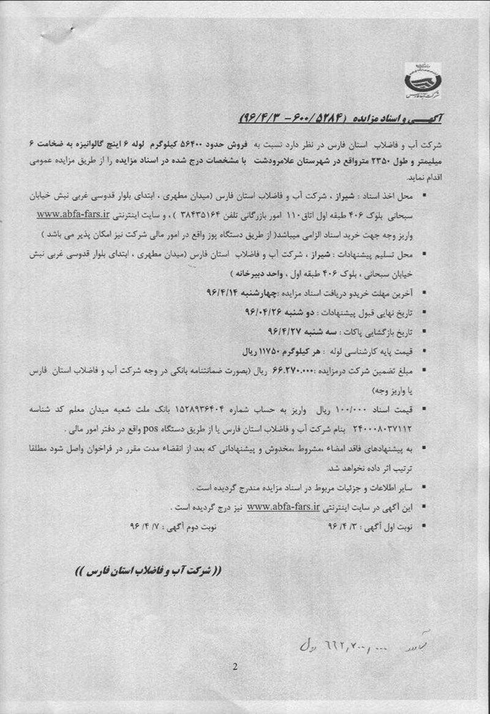 فروش حدود 827723 کیلوگرم لوله فولادی در سایزهای مختلف واقع در خط انتقال شهرستان فسا