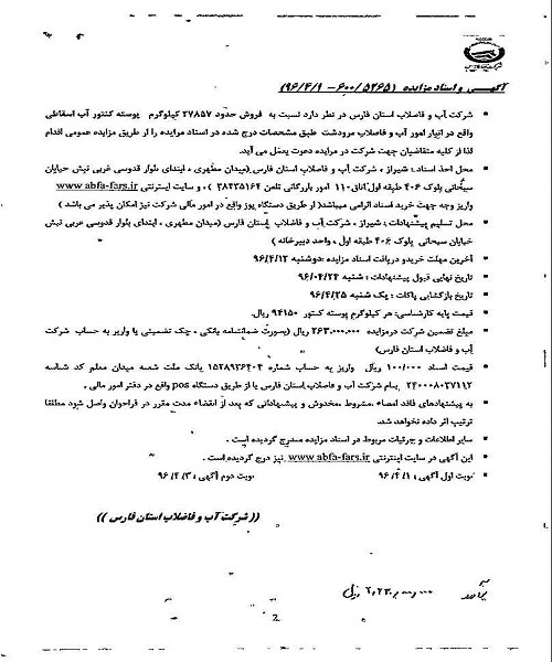 فروش حدود 27857 کیلوگرم پوسته کنتور آب اسقاطی واقع در انبار امور آب و فاضلاب مرودشت