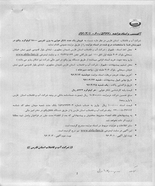فروش یک عددتانکر هوایی به وزن تقریبی 18000 کیلوگرم واقع در شهرستان فسا