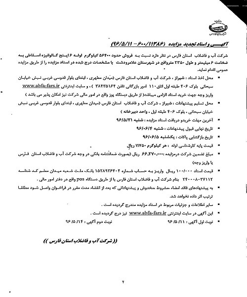 فروش حدود 827723 کیلوگرم لوله فولادی در سایزهای مختلف واقع در خط انتقال شهرستان فسا