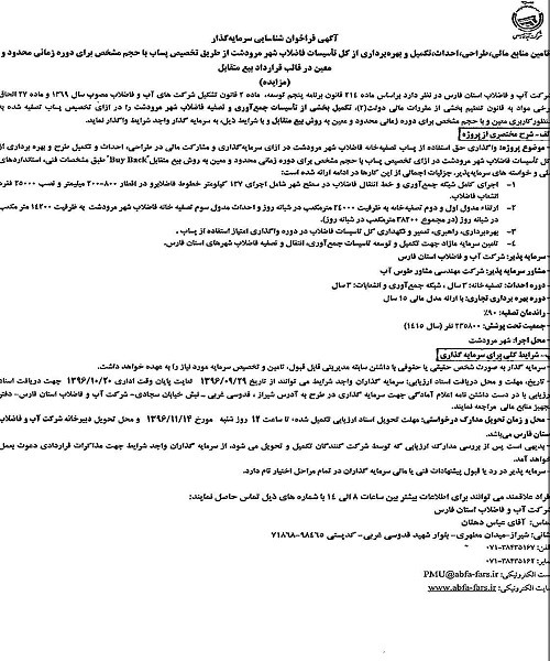 تامین منابع مالی ، طراحی ، احداث ، تکمیل و بهره برداری از کل تاسیسات فاضلاب شهر مرودشت از طریق تخصیص پساب با حجم مشخص برای دوره زمانی محدود و معین در قالب قرارداد بیع متقابل