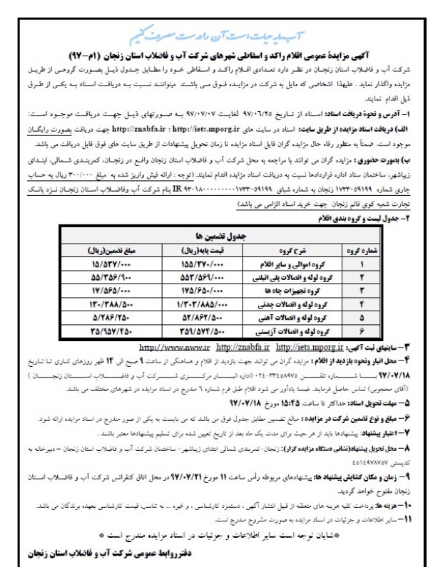 آگهی مزایدة عمومی اقلام راکد و اسقاطی شهرهای شرکت آب و فاضلاب استان زنجان (1م-97)