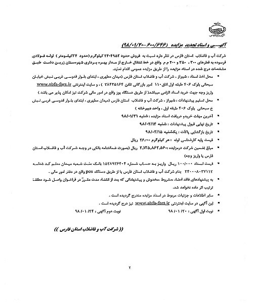 فروش حدود 827723 کیلوگرم لوله فولادی در سایزهای مختلف واقع در خط انتقال شهرستان فسا