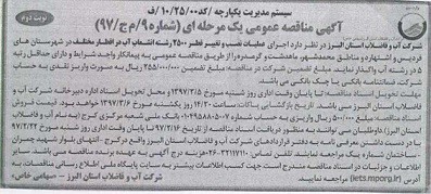 سیستم مدیریت یکپارجه / کد 00/25/10/ف آگهی مناقصه عمومی یک مرحله ای (شماره 9/م ج/97) شرکت آب وفاضلاب استان البرز در نظردارد اجرای عملیات نصب و تغییر قطر 2500 رشته انشعاب آب در اقطار مختلف در شهرستان های فردیس و اشتهاد و مناطق محمدشهر , ماهدشت و گرمدره را از طریق مناقصه عمومی به پیمانکار واجد شرایط و دارای حداقل رتبه 5 در رشته آب واگذار نماید. مبلغ تضمین شرکت در مناقصه : مبلغ تضمین 255.000.000 ریال به صورت واریز نقدی به حساب شرکت , ضمانتنامه بانکی و یا چک بانکی می باشد. مهلت تحویل اسناد مناقصه : تا پایان وقت اداری روز شنبه مورخ 5/3/97 و محل تحویل اسناد اداره دبیرخانه شرکت آب و فاضلاب استان البرز می باشد. تاریخ بازگشایی پاکات : ساعت 14:30 روز یکشنبه مورخ 6/3/97 خواهد بود. قیمت فروش اسناد مناقصه: مبلغ 500.000 ریال واریزی به حساب شماره 0104958805007 بانک ملی شعبه مرکزی کرج. ( به نام آب و فاضلاب استان البرز). داوطلبان میتوانند به منظور دریافت اسناد مناقصه از تاریخ 16/2/97 تا پایان وقت اداری روز شنبه مورخ 22/2/97 با دردست داشتن معرفی نامه به دفتر قراردادهای شرکت آب وفاضلاب استان البرز واقع درکرج- انتهای بلوارشهید چمران ـ ساختمان شماره یک مراجعه نمایند. تلفن تماس : 32117110-026 هزینه درج آگهی به عهده برنده مناقصه می باشد. سایر اطلاعات و جزئیات در اسناد مناقصه مندرج است. جهت کسب اطلاعات بیشتر به سایت پایگاه ملی اطلاع رسانی مناقصات ، به آدرس iets.mporg.ir) ) مراجعه نمایید. شرکت آب وفاضلاب استان البرز «سهامی خاص» |