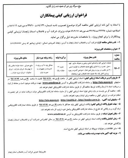 آگهی ارزیابی کیفی مناقصه عمومی دومرحله ای عملیات اجرایی کلیه واحدهای اصلی وجنبی و محوطه سازی نصب و راه اندازی پکیج تصفیه فاضلاب شهر ارمغانخانه 2-97