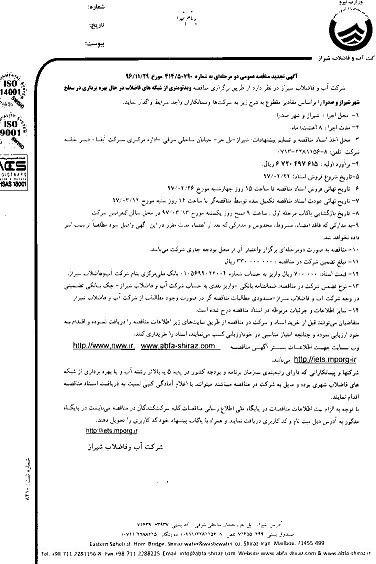 برونسپاری ارائه خدمات امداد، نگهداری و تعمیرات ، انجام خدمات پیشگیرانه شبکه های توزیع آب ، چاهها و مخازن آب و حراست فیزیکی از تاسیسات شهرستان کبودراهنگ