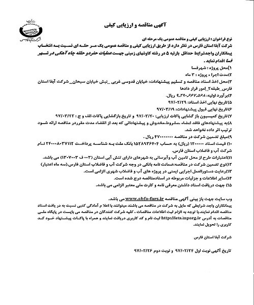 برونسپاری ارائه خدمات امداد، نگهداری و تعمیرات ، انجام خدمات پیشگیرانه شبکه های توزیع آب ، چاهها و مخازن آب و حراست فیزیکی از تاسیسات شهرستان کبودراهنگ