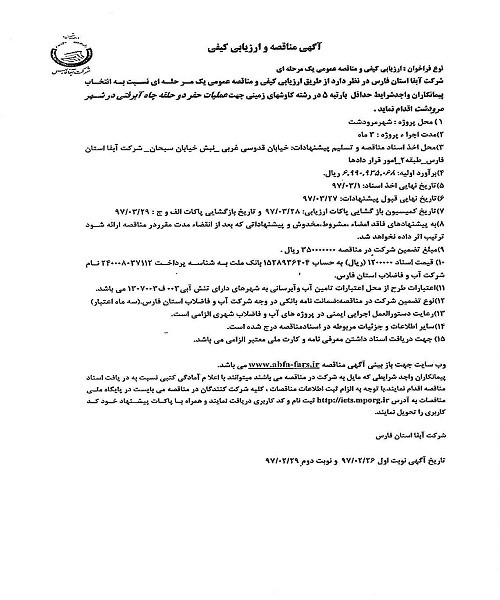برونسپاری ارائه خدمات امداد، نگهداری و تعمیرات ، انجام خدمات پیشگیرانه شبکه های توزیع آب ، چاهها و مخازن آب و حراست فیزیکی از تاسیسات شهرستان کبودراهنگ