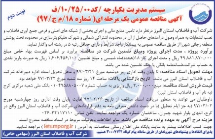 بسمه تعالی سیستم یکپارچه مدیریت / کد فرم 00/25/10/ف آگهی مناقصه عمومی یک مرحله ای (شماره 18/م ج/97) شرکت آب وفاضلاب استان البرز در نظردارد تامین منابع مالی و اجرای بخشی از شبکه های اصلی و فرعی جمع آوری فاضلاب و نصب انشعابات به همراه وصول درآمدهای حاصل از آن در محدوده اشتراکی شمالی و شهرک هلیکوپترسازی در محدوده تحت پوشش منطقه رجائی شهر را از طریق مناقصه عمومی به پیمانکار واجد شرایط و دارای حداقل رتبه 5 در رشته آب واگذار نماید. برآورد پروژه, مدت اجرای پروژه و مبلغ تضمین شرکت در مناقصه : برآورد بر اساس فهرست بهاء خاص 49.881.870.000 ریال , مدت اجرای کار 18 (هجده) ماه و مبلغ تضمین 1.606.456.100 ریال به صورت واریز نقدی به حساب شرکت , ضمانتنامه بانکی و یا چک تضمین شده بانکی می باشد. مهلت تحویل اسناد مناقصه : تا پایان وقت اداری روز دوشنبه مورخ 21/3/97 و محل تحویل اسناد اداره دبیرخانه شرکت آب و فاضلاب استان البرز می باشد. تاریخ بازگشایی پاکات : ساعت 14 روز سه شنبه مورخ 22/3/97 خواهد بود. قیمت فروش اسناد مناقصه: مبلغ 3.000.000 ریال واریزی به حساب شماره 0104958805007 بانک ملی شعبه مرکزی کرج. ( به نام آب و فاضلاب استان البرز). داوطلبان میتوانند به منظور دریافت اسناد مناقصه از تاریخ 26/2/97 تا پایان وقت اداری روز چهارشنبه مورخ 2/3/97 با دردست داشتن معرفی نامه به دفتر قراردادهای شرکت آب وفاضلاب استان البرز واقع درکرج- انتهای بلوارشهید چمران ـ ساختمان شماره یک مراجعه نمایند. تلفن تماس : 32117110-026 هزینه درج آگهی به عهده برنده مناقصه می باشد. سایر اطلاعات و جزئیات در اسناد مناقصه مندرج است. جهت کسب اطلاعات بیشتر به سایت پایگاه ملی اطلاع رسانی مناقصات ، به آدرس iets.mporg.ir) ) مراجعه نمایید. شرکت آب وفاضلاب استان البرز «سهامی خاص» |