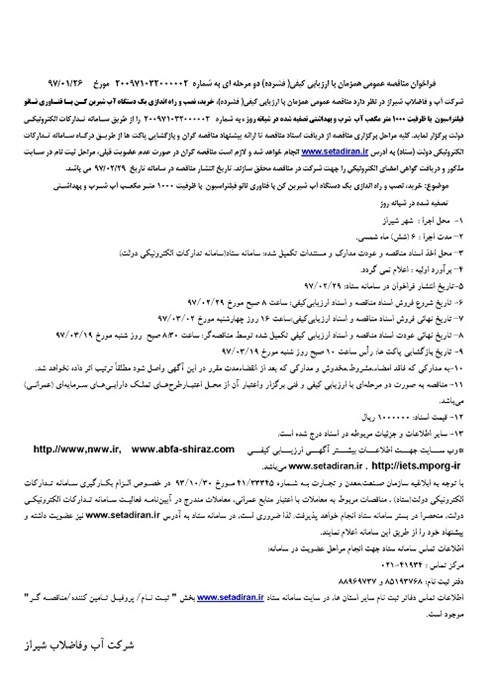 برونسپاری ارائه خدمات امداد، نگهداری و تعمیرات ، انجام خدمات پیشگیرانه شبکه های توزیع آب ، چاهها و مخازن آب و حراست فیزیکی از تاسیسات شهرستان کبودراهنگ