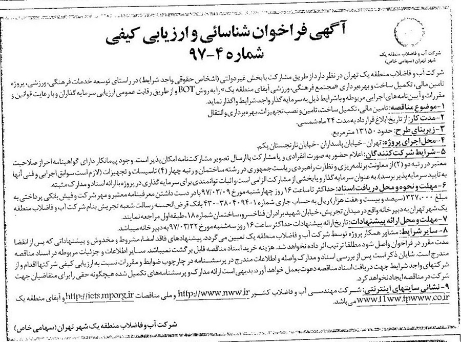 تامین مالی، تکمیل ساخت، تامین و نصب تجهیزات، بهره برداری و انتقال مجتمع فرهنگی ، ورزشی آبفا منطقه یک