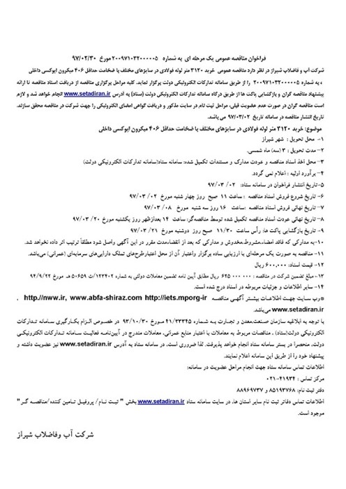 برونسپاری ارائه خدمات امداد، نگهداری و تعمیرات ، انجام خدمات پیشگیرانه شبکه های توزیع آب ، چاهها و مخازن آب و حراست فیزیکی از تاسیسات شهرستان کبودراهنگ