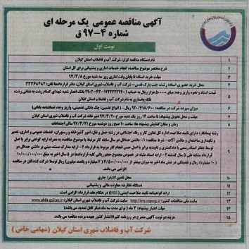 محل خرید حضوری اسناد : رشت ، جنب پارک قدس – شرکت آب و فاضلاب شهری استان گیلان، دفتر قراردادها تلفن : 33368482 |
