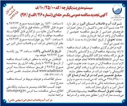 بسمه تعالی سیستم مدیریت یکپارچه / کد 00/25/10/ف آگهی تجدید مناقصه عمومی یک مرحله ای (شماره 26/الف ع/97) شرکت آب وفاضلاب استان البرز درنظر دارد 23 عدد شیرآلات چدن داکتیل را از محل اعتبارات طرحهای عمرانی را از طریق مناقصه عمومی از منــاقصـه گران واجد شرایط خریداری نماید. مدت تحویل : از تاریخ انعقاد قــرارداد به مدت 1 (یک) ماه تعیین می گردد. کلیه مراحل برگزاری مناقصه از دریافت اسناد مناقصه تا ارائه پیشنهاد مناقصه گران و بازگشایی پاکت ها از طریق درگاه سامانه تدارکات الکترونیکی دولت (ستاد ) به آدرس www.setadiran.ir انجام خواهد شد و لازم است مناقصه گران در صورت عدم عضویت قبلی , مراحل ثبت نام در سایت مذکور و دریافت گواهی امضای الکترونیکی را جهت شرکت در مناقصه محقق سازند. مبلغ تضمین شرکت در فرایند ارجاع کار : 278.735.000 میباشدکه می بایست بصورت واریز نقدی, ضمانتنامه بانکی به نام شرکت آب و فاضلاب استان البرز و یا اوراق مشارکت باشد. مهلت تحویل اسناد مناقصه : پیشنهاد دهندگان می بایست مدارک لازم را مطابق مندرجات برگ شرایط تا ساعت 15:30 روز چهارشنبه مورخ 23/3/97 بصورت فایل pdf در سامانه فوق بارگذاری نمایند. مناقصه گران علاوه بر بارگذاری فایل pdf اسناد مناقصه , موظف به ارائه آن در پاکت لاک و مهر شده تا ساعت 15:30 روز چهارشنبه مورخ 23/3/97 به دفتر قراردادهای شرکت آب و فاضلاب استان البرز می باشند. تاریخ بازگشایی پاکات : ساعت 14 روز یکشنبه مورخ 27/3/97 خواهد بود. داوطلبان می توانند به منظور دریافت اسناد مناقصه از تاریخ 5/3/97 تا پایان وقت اداری روز سه شنبه مورخ 8/3/97 از طریق سامانه ستاد به آدرس www.setadiran.ir اقدام نمایند. تلفن تماس: 32117109 - 026 سایر اطلاعات و جزئیات مربوط در اسناد مناقصه مندرج است. جهت کسب اطلاعات بیشتر به سایت پایگاه ملی اطلاع رسانی مناقصات ، به آدرس iets.mporg.ir) ) مراجعه نمایید. شرکت آب و فاضلاب استان البرز « سهامی خاص » |