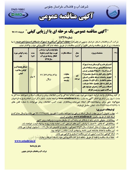 "آگهی مناقصه عمومی یک مرحله ای با ارزیابی کیفی" تاریخ:08/03/97 شماره11346 شرکت آب و فاضلاب استان خراسان جنوبی در نظردارد عملیات اجرائی آبرسانی به شهرک مشاغل (صنوف)بیرجند را با مشخصات زیر از طریق مناقصه براساس قانون برگزاری مناقصات از طریق سامانه تدارکات الکترونیکی دولت واگذار نماید. | ردیف | مشخصات پروژه | محل اجرا | دستگاه نظارت | مبلغ اولیه برآورد براساس فهرست بهاء ابنیه وخطوط انتقال وشبکه توزیع آب سال1397 | مدت اجرا | رتبه و گواهی مورد نیاز | | 1 | اجرای طرح آبرسانی به شهرک صنوف(مشاغل)شهر بیرجند وشبکه اصلی آن با خط 400 و315 میلیمتر چدن داکتیل و پلی اتیلن به طول مجموع 4 کیلومتر واحداث شبکه داخلی اصلی مجتمع با اقطار 200و160و110 میلیمتر پلی اتیلن به طول مجموع 1880 متر،نصب اتصالات وشیرآلات واجرای حوضچه های شیرآلات، تجهیز و برچیدن کارگاه | شهر بیرجند | معاونت مهندسی وتوسعه | 22.639.795.765 ریال | 7 ماه | حداقل پایه5 آب و گواهی صلاحیت ایمنی | از کلیه پیمانکاران واجد شرایط دعوت میشود جهت اعلام آمادگی وکسب اطلاعات بیشتر و دریافت اسناد و دعوتنامه حداکثر به مدت 4 روز پس ازتاریخ انتشار آگهی به سایت ستادwww.setadiran.ir مراجعه نمایند. شایان ذکر است اعلام پاسخ به فراخوان هیچگونه حقی برای پیشنهاددهندگان ایجاد نمینماید.پیمانکاران جهت کسب اطلاعات بیشتر میتوانند با شماره تلفن های 32433406-32432645-056 تماس حاصل فرمایند. توضیحات ضروری: 1- مهلت تحویل:آخرین مهلت ارسال اسناد ارزیابی و دعوتنامه ساعت12ظهرروز یکشنبه27/03/97 می باشد و ارسال مدارک و اسناد فقط از طریق سایت: www.setadiran.ir امکانپذیر است. 2- پیمانکاران حقوقی دارای رتبه 5 یا بالاتر در رشته آب از سازمان مدیریت و برنامه ریزی کشور 3- پیمانکارانی که بالای 70 امتیاز را براساس آیتم های ارزیابی کسب نمایند وارد پروسه پیشنهاد قیمت خواهند شد. 4- اعتبار این پروژه از محل اعتبارات سال96و97 (عمرانی- جاری) و تخصیص در سال96 (400 میلیون تومان) می باشد. 5- این مناقصه با لحاظ بخشنامه تعیین دامنه پیشنهادی قیمت متناسب خواهد بود. 6- ارائه گواهی صلاحیت ایمنی در این مناقصه اجباری و الزامی می باشد. 7- لطفاً اسناد مناقصه را فقط از طریق سامانه تدارکات الکترونیکی دولت(ستاد) دریافت نمائید. www.setadiran.ir دفتر قراردادها شرکت آب و فاضلاب خراسان جنوبی |